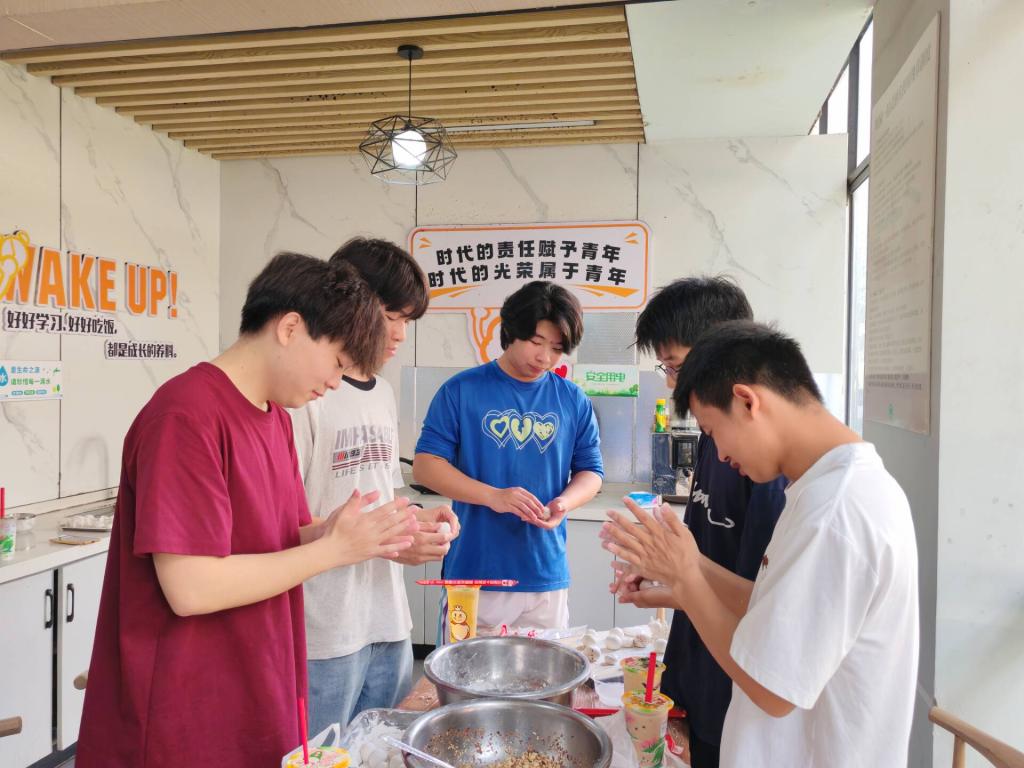 活动现场气氛热烈、分工有序。同学们以传统美食制作为载体,通过和面做汤圆、煮糯米打糍粑等沉浸式实践,在烟火气息中感悟中华优秀传统文化的独特魅力。汤圆和糍粑虽小,却承载着团圆的期盼、游子的乡愁,更是多民族文化交融共生的生动符号。共享厨房内,同学们分工协作、配合默契,有人专注煮制软糯的糯米,有人细细捣碎喷香的花生,热气氤氲间,欢声笑语此起彼伏。更具匠心的是,同学们将创意融入传统:有的揉搓出圆润规整的经典汤圆,有的巧手捏制出饺子样式的别致造型,更有同学将面团化为手工素材,打造出形态各异、妙趣横生的创意作品。一颗颗汤圆,包裹的不仅是甜蜜馅料,更是同学们对民俗乐趣的体悟与对团圆暖意的向往。