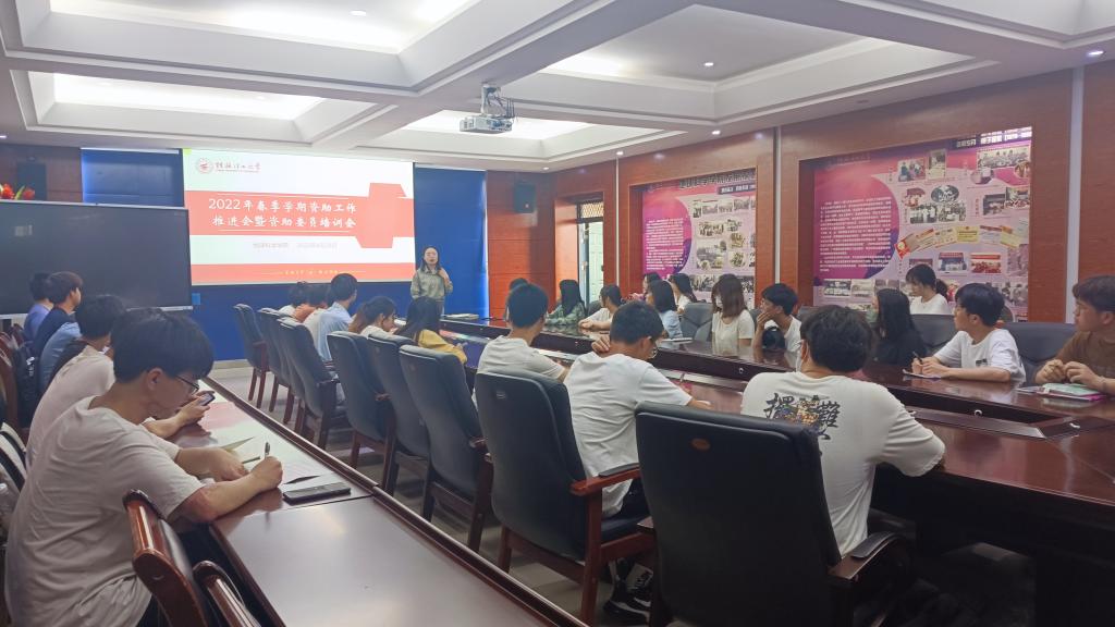 2022年4月28日,伟的国际1946bv2022年春季学期资助工作推进会暨资助委员培训会在逸夫楼01215会议室顺利召开,学院资助专项工作辅导员夏雪莲主持会议,全体资助委员参加。
