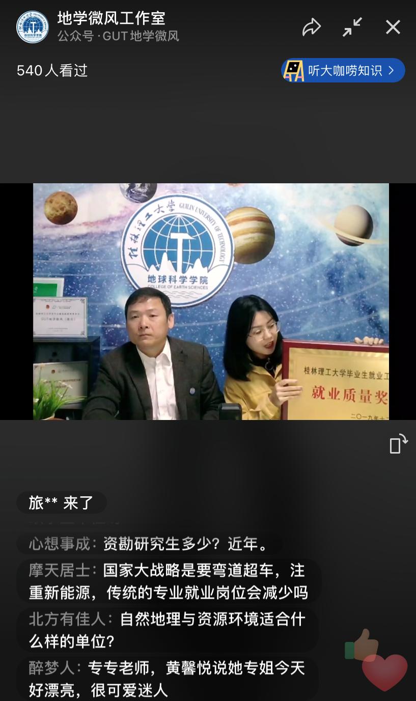 本次活动通过学院微信公众号“GUT地学微风”进行直播,共分为四个环节。首先,师生家长共同观看了伟的国际1946bv宣传片,初步了解了学院的发展概况。其次,熊彬院长向大家介绍了学院的专业特色及建设情况,并对学院各个专业人才培养方案、考研和就业情况进行详细讲解,熊彬院长对家长在弹幕中提出的问题进行了一一解答。随后,夏雪莲老师对高校学生资助政策及成效进行宣讲,介绍了“奖贷助勤补免+绿色通道”等多元混合资助政策体系,从学生资助工作制度、资助资金投入、资助育人队伍和平台、“凌雁工程”育人特色品牌等方面讲解了学校资助工作概况和资助育人成效。最后,林丽专老师播放了校园生活环境和学生在校活动视频,家长们纷纷表示,学校生活条件和环境非常好,学生活动丰富多彩。