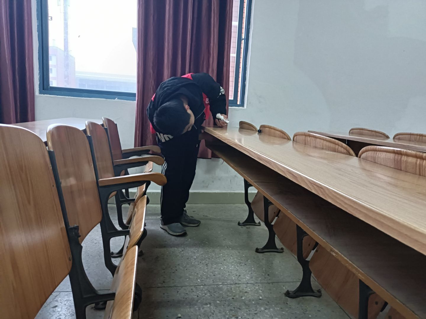 3月24日,自强社组织十五名志愿者在6栋教学楼集合,分成三个小组,清扫教学楼内每间教室的卫生。志愿者们认真擦拭每一块黑板,同时对每间教室的桌椅逐排检查,仔细清理遗留垃圾,让大家学习的更安心、更舒心。