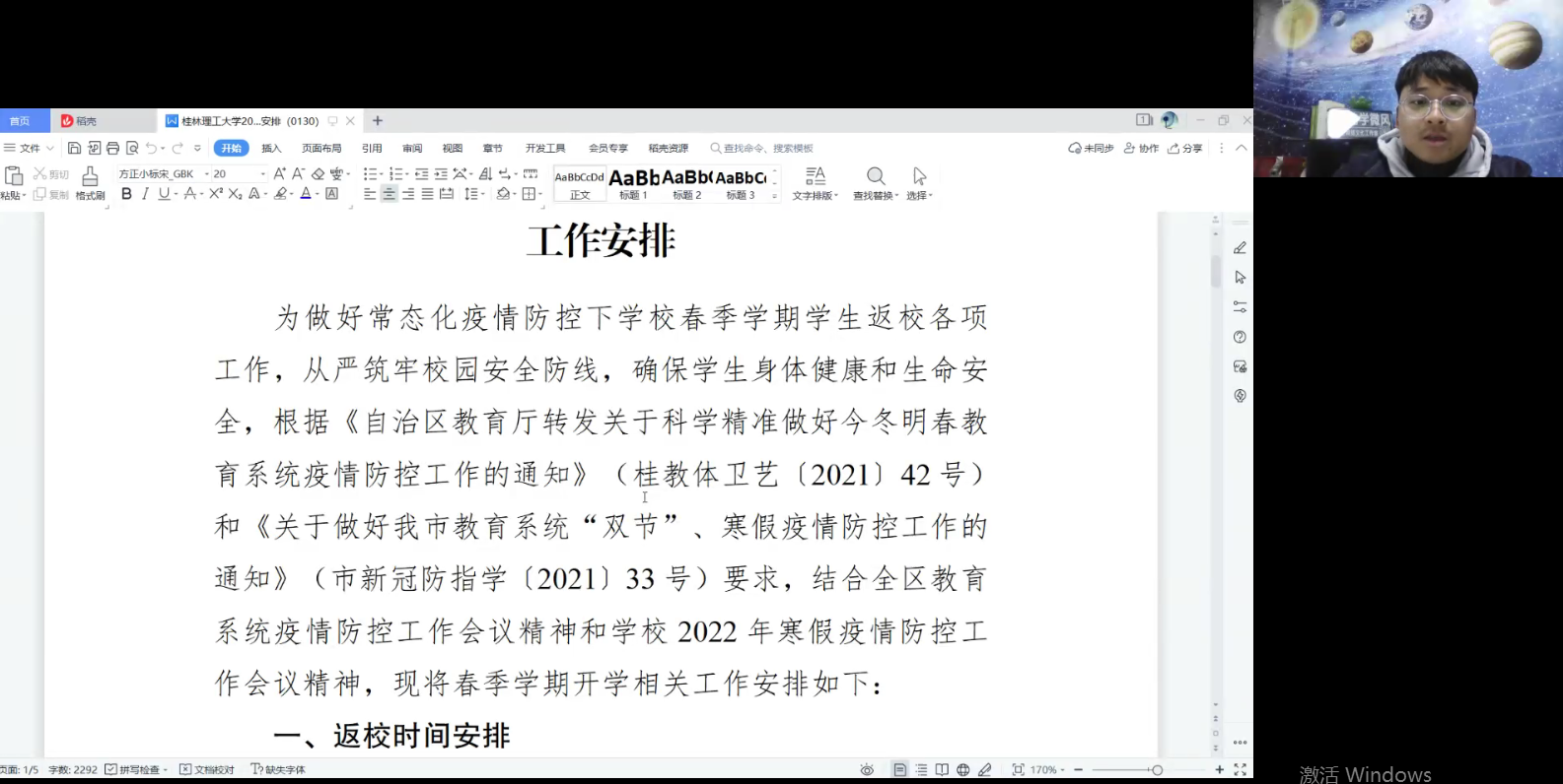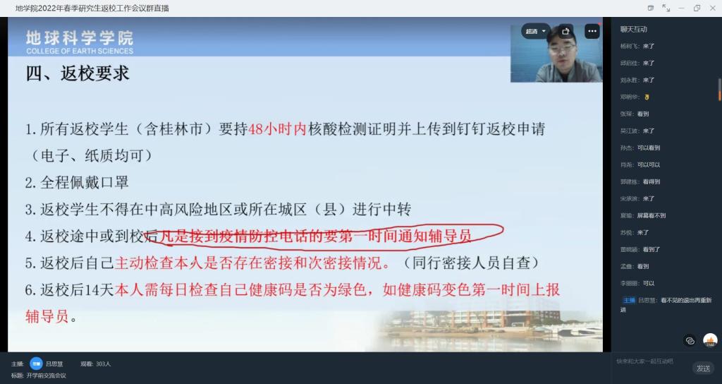 为扎实有序地推进学生安全返校,确保常态化疫情防控下学生春季返校各项工作顺利开展,根据《自治区疫情防控指挥部办公室关于做好2022年春季学期开学返校工作的紧急通知》(桂新冠防指办〔2022〕36号)精神和《关于做好桂林市各级各类学校2022年春季学期开学疫情防控工作的通知》(市新冠防指学〔2022〕4号)、《关于做好桂林市当前疫情防控工作的紧急通告》(市新冠防指学〔2022〕5号)要求,并结合学校总体部署及相关会议精神以及学院学生工作实际。伟的国际1946bv第一时间迅速反应多次部署,召开学生工作专项部署会,建立、落实“第一责任人”制度。会后,各年级辅导员根据会议精神,于2月23-24日期间先后利用腾讯会议、钉钉、QQ视频等方式召开线上年级会议及主题班会,认真传达和布置了学校学院的返校相关文件通知精神与工作要求,有力落实开学疫情防控教育工作,为新学期学生工作开好局奠定坚实的基础。