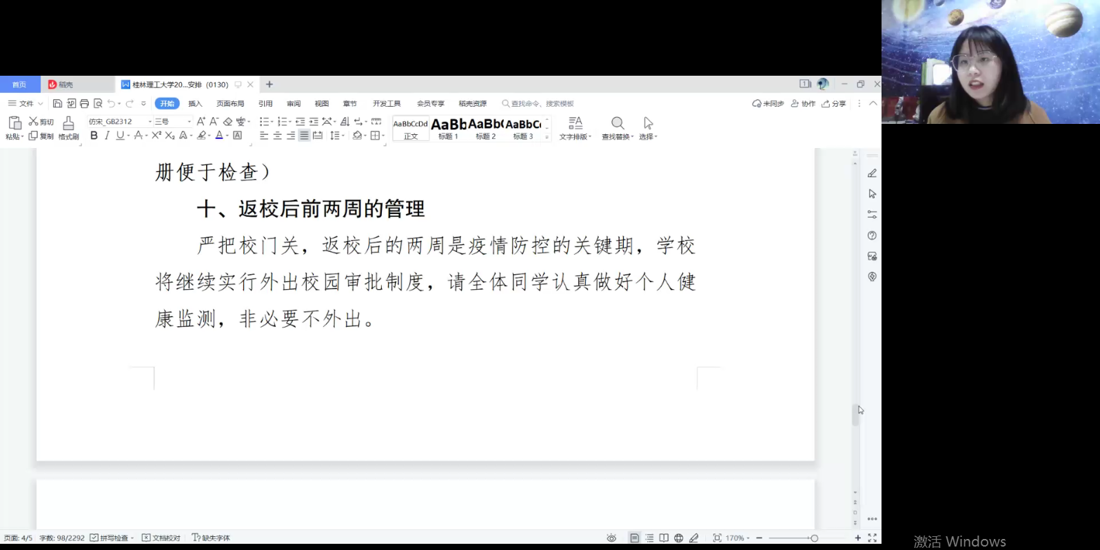 各年级辅导员、班主任带领学生学习了《关于做好学校2022年春季学期学生延期返校及开学前疫情防控工作的通告》,对暂缓返校学生及申请返校指引、学生返校途中应注意的事项和返校后学校管理的相关规定等进行了详细的解释,再三强调要严格遵守学校疫情防控纪律和要求,并在返校途中做好安全防护,要全程佩好戴口罩,保持社交距离,进入校园后积极配合学校校园管理规定,做好个人健康检查,成立在线学习生活帮扶小组,全力保障暂缓返校学生教育教学及各项工作不掉队,最后提醒学生临近返校非必要不外出,制定计划、调整状态,以饱满的激情投入到开学学习生活中去。