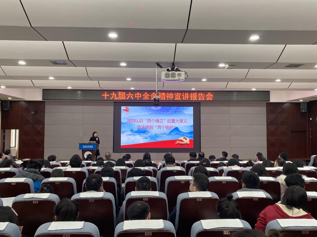 会上,邱杰带领大家从习近平新时代中国特色社会主义思想、马克思主义中国化的新的飞跃、“两个确定”的重要意义等方面详细解读了十九届六中全会精神。首先,邱杰以“1、2、4、5、10、13”六个数字,通过系统的梳理分享了学习体会,加深大家对十九届六中全会精神的核心要义和主旨精髓的全面准确把握。其次,她从实践层面和理论层面解读了“两个确立”的重大意义。接着,她表示所有师生要努力通过先学深学,坚定理想信念;勤学精学,练就过硬本领;领学助学,引领共同成长来落实好“两个维护”。最后,她强调,要深刻领悟“两个确立”的决定性意义,坚决捍卫“两个确立”,切实把“两个确立”内化于心、外化于行,真正转化为坚决做到“两个维护”的思想自觉、政治自觉、行动自觉。