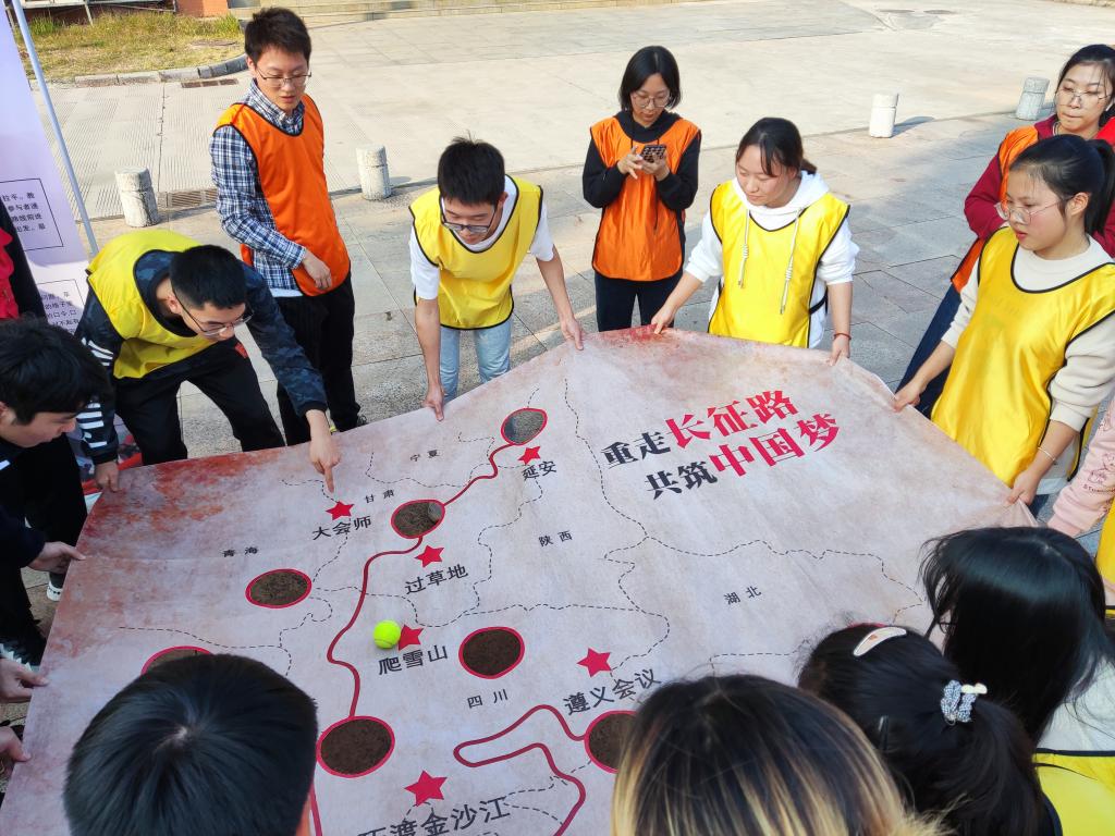 本次素质拓展活动根据新民主主义革命时期、社会主义革命和建设时期、改革开放和社会主义现代化建设新时期、中国特色社会主义新时代四个不同历史时期,分为了“重走长征路”“携手奋斗路”“摸石头过河”“奋进新时代”四个主题环节。“重温长征路”环节,队员们通过同心协作控制小球的走向,重温革命先辈们走过的万里长征路,在协同合作中深刻体会革命先辈的艰辛。“摸石头过河”项目,队员们在指定区域闭上眼睛穿越雷区,让大家知道因为革命先辈给出的经验,才让我们更易分清应该走哪条路。“奋进新时代”环节,队员通过单腿跳的方式,跳到投掷线处,手持沙包,向准靶盘中心进行投掷,回顾了革命先辈打仗时的艰辛岁月。“携手奋斗路”环节则是让每位队员认识到合作的重要性,单丝不成线,独木不成林,国家的富强和民族的复兴需要我们一代又一代人的努力付出。