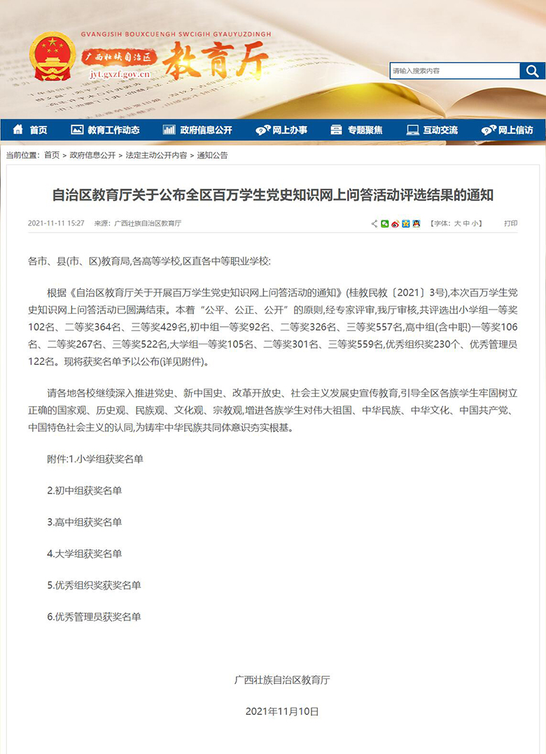 为热烈庆祝中国共产党成立100周年,讴歌中华民族实现伟大复兴的奋斗历程,根据自治区教育厅下发的《自治区教育厅关于开展百万学生党史知识网上问答活动的通知》(桂教民教〔2021〕3号)要求,我校积极组织全校学生参加本次党史知识网上问答活动。经专家评审、教育厅审核,我院伟的国际1946bv学生张能鑫荣获大学组一等奖。