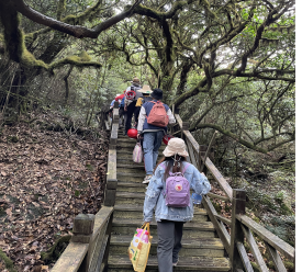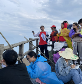 实习途中偶遇下雨,暂缓了我们登顶的脚步,考虑到学生的安全问题,我们只得稍事休息。可爱天公作美,一阵云海过后,渐渐雨势变小,同学们跃跃欲试,一边感叹大自然的鬼斧神工,一边不忘带上记录本向华南之巅出发。尽管登顶的道路因为刚才的小雨有些许的湿滑崎岖,但是沿途的风景却是美好绚丽的,特别是登顶过程中老师跟同学们的互相帮助,互相搀扶,更加深了师生友谊,构成了山间最美的风景。经过大家的不懈努力,我们终于到达上了华南的最高处,张桂林老师和李仁成老师分别就专业知识展开详细的讲解,尽管山上的风很大,但是同学们依旧纷纷拿出了自己的记录本认真记录,不负美景,不负知识,不负青春。